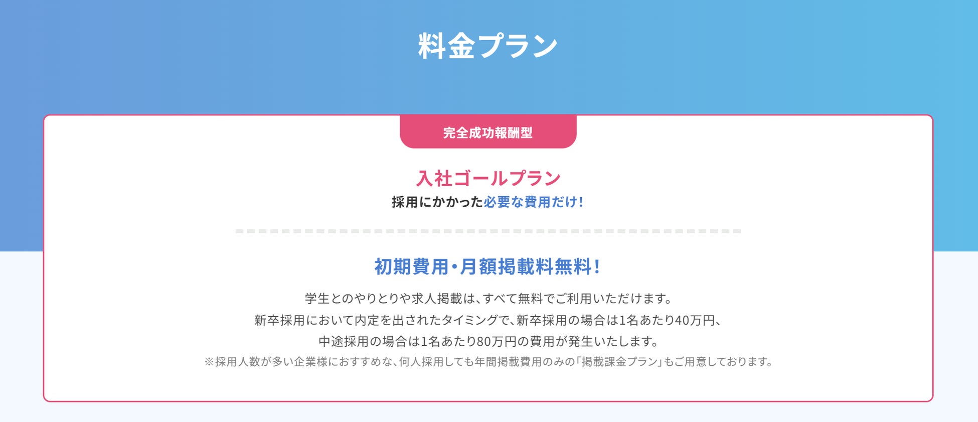 入社1名につき40万円(税別)を成果時にのみ請求