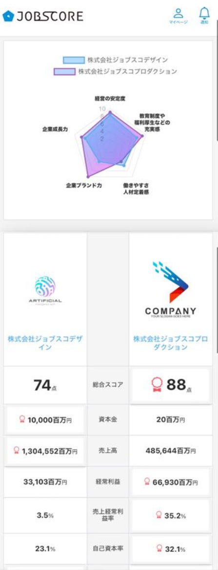 ジョブスコアの比較機能では、すべての掲載企業を「経営の安定性」「教育・福利厚生」「働きやすさ」「ブランド力」「成長力」の5つのスコアで見える化。複数の企業を一目で横並びで比較できる仕組みを提供しています。